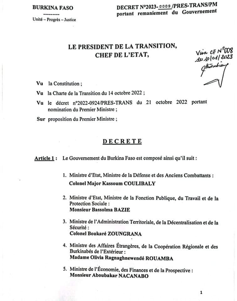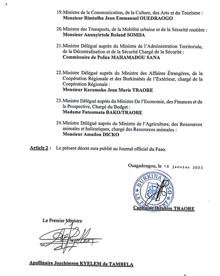 Burkina-décret N°2023-0009/PRES-TRANS/PM portant remaniement du Gouvernement.